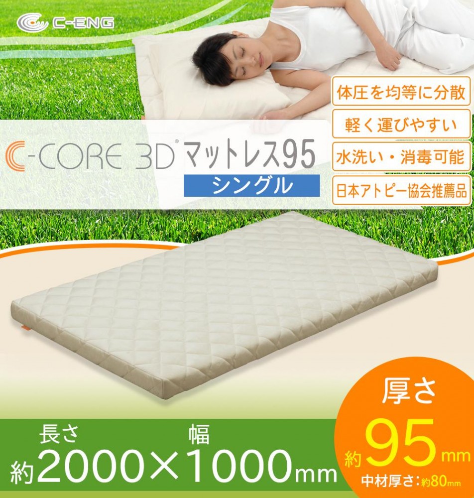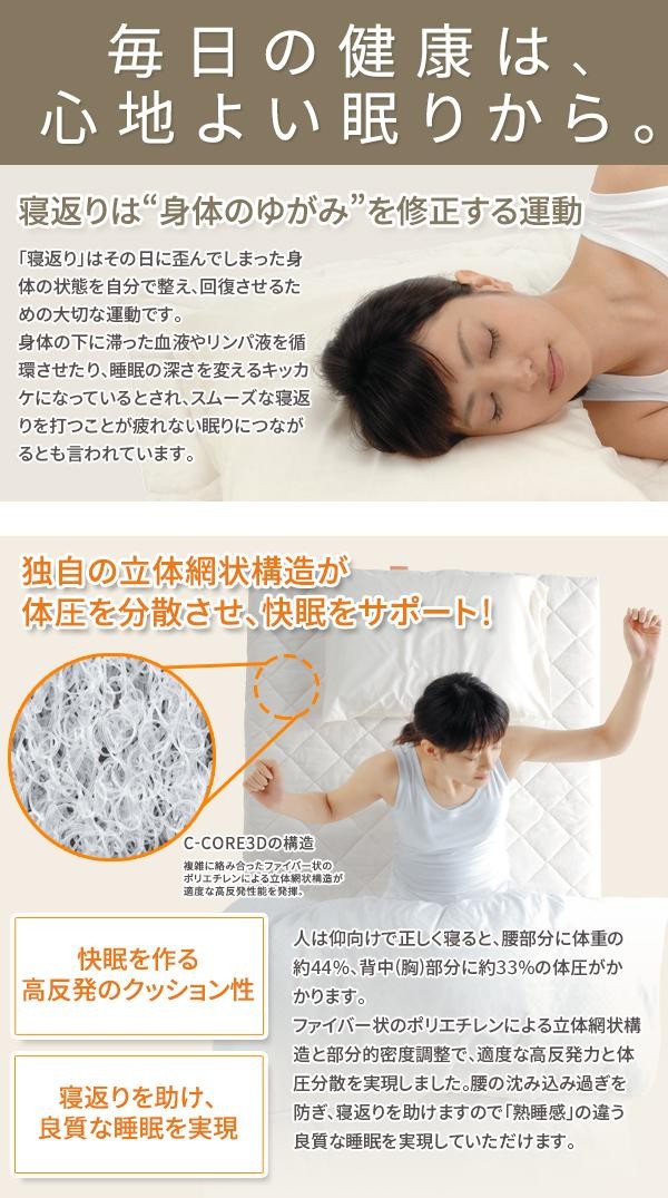 | 中材に使用しているC-CORE3Dは適度な反発力があり、体圧分散性に優れています。C-CORE3Dは繊維が網状に絡み合った構造をしているため、通気性に優れ、湿気がこもることがありません。カバーは直接肌に触れても刺激のないマイクロファイバー&キルト面とソフトで通気性の良いダブルラッセル面がありますので、シーズンに合わせてお使いいただけます。日本アトピー協会推薦品。空気が循環しやすく患部を衛生的に保てます。 |