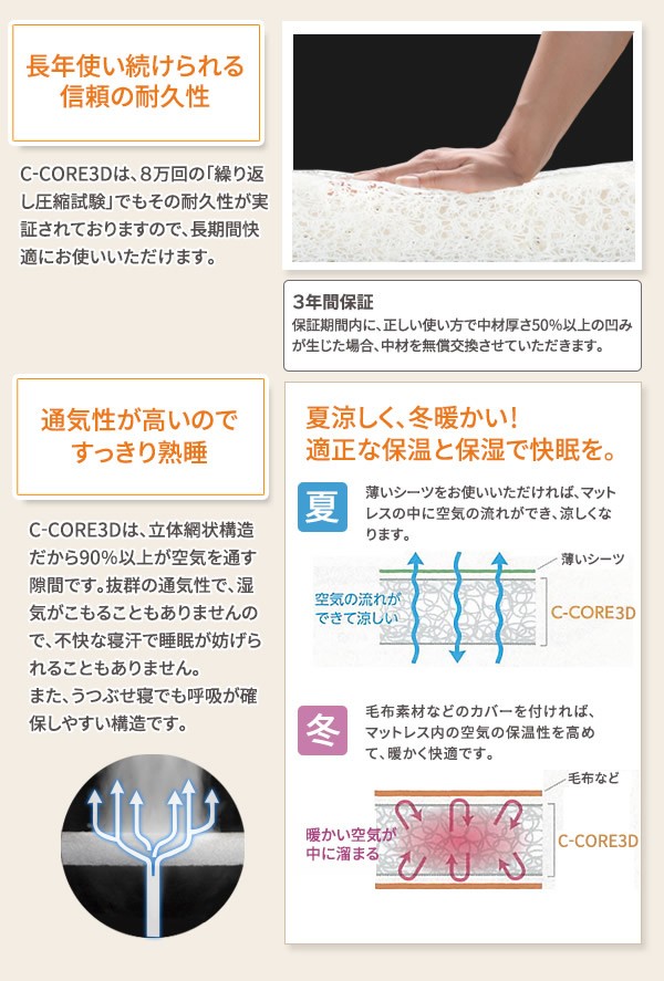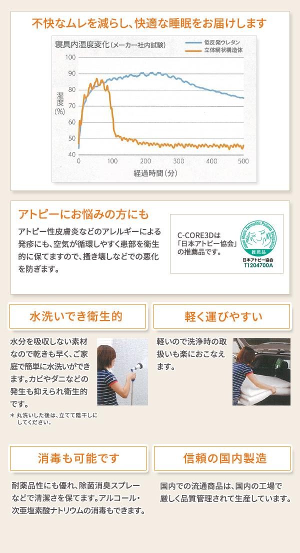 中材に使用しているC-CORE3Dは適度な反発力があり、体圧分散性に優れています。C-CORE3Dは繊維が網状に絡み合った構造をしているため、通気性に優れ、湿気がこもることがありません。カバーは直接肌に触れても刺激のないマイクロファイバー&キルト面とソフトで通気性の良いダブルラッセル面がありますので、シーズンに合わせてお使いいただけます。日本アトピー協会推薦品。空気が循環しやすく患部を衛生的に保てます。 |