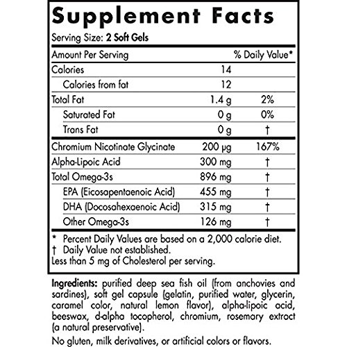 Ingredients: purified deep sea fish oil (from anchovies and sardines), soft gel capsule (gelatin, glycerin, purified water USP, caramel color), d-alpha tocopherol, alpha-lipoic acid, chromium, rosemary extract, yellow beeswax, soy lecithin