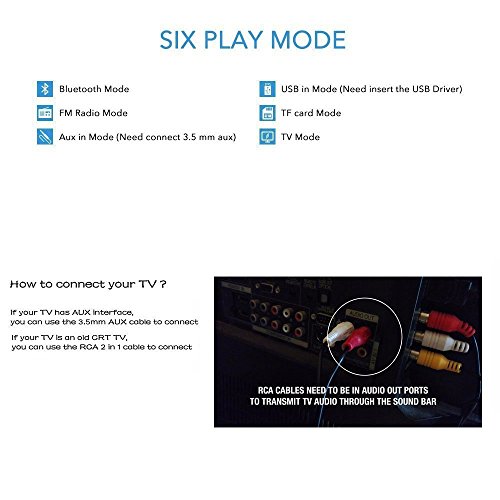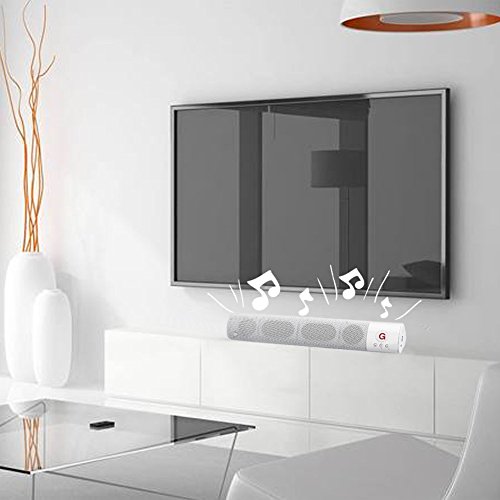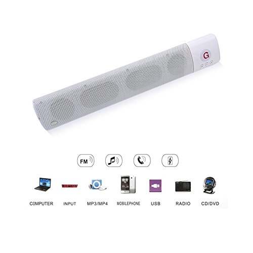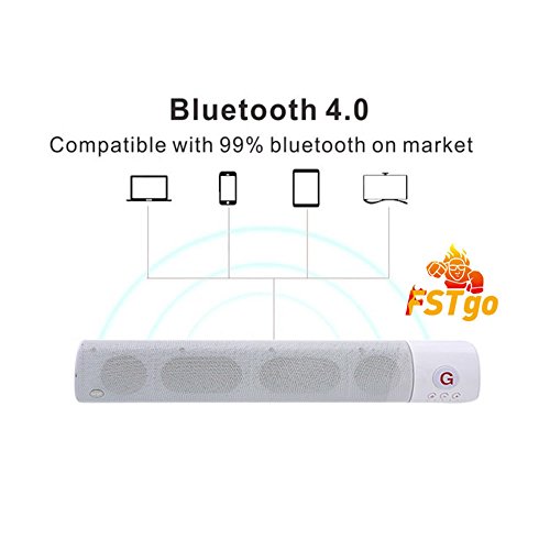 -. Feature : FSTgo Bluetooth Speaker: Stylish and Slim, Portable; Built-in six play mode( Bluetooth 4.0,FM Radio, TF Card, TV mode and AUX in mode, USB in mode needed with insert USB Driver), Lithium-ion Battery18650 2000mAh; English and Chinese User Manual ; clear highs to enjoy at home or outdoor. Plays music up to 33 feet (10 meters) from any Bluetooth-enabled device, suports the playing 4-5 hours / Mini TV Sound Bar System: Connect the speaker with your TV, and Enjoy a 3D Stereo Sound High Definition SUPER stereo sound with a impressive volume whether you're lounging around the house,or partying,walking out,camping,hiking,biking and outdoor sports.No speaker this size can really give you booming bass. / Bluetooth & Wireless Function: Connects via Bluetooth or a 3.5mm stereo AUX cable (included) , Load music via micro SD & USB supported; Comes with a Micro USB to USB charging cable and 3.5mm stereo cable. / Multi-function: FM Radio, Build-in Mic, Support Handsfree for Smart Mobile Phone / Perfect speaker for shower beach pool surfing or home, speaker dimensions: 43 x7x 5 cm
