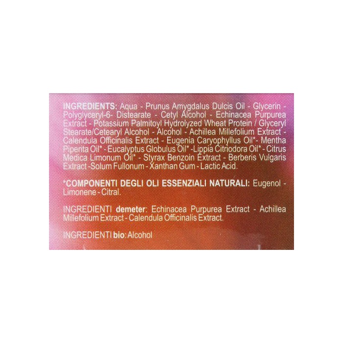 전성분 : 수,아몬드유,글리세린,무라사키 바렌《기쿠에키스》,PAL《미토이루》가수분해 COM《기탄파쿠》K,스테아린산 글리세릴,《세테아리루아루코루》,JIS《데아린》산 폴리 글리세릴-6,《세타노루》,에탄올,hurrah토,《세이요우노코기리소우에키스》,토 금잔화꽃 엑기스,나비 더 봉오리유,《세이요우핫카》유,eucaly엽유,레몬 과피유,곰《즈즈라》유,앤 소《고우에키스》,《세이요우메기에키스》,산탄검(Xanthan Gum),유산