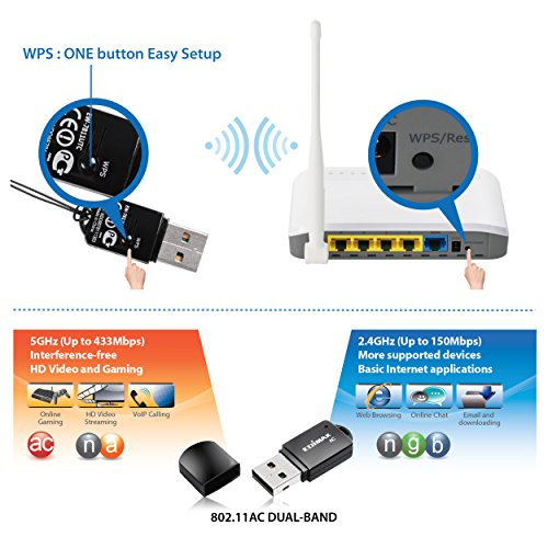 Edimax EW-7811UTC enables you to upgrade your wireless device to dual-band 802.11ac with the fastest blistering Wi-Fi speeds on the interference free 5Ghz frequency band. Enjoy better performance and greater flexibility for your Wi-Fi devices, using dual-band connectivity. The EW-7811UTC provides connectivity for the 2.4GHz band at speeds of 150Mbps or 5Ghz band at speeds of 433Mbps. Upgrade PC's and notebooks to super high speed 802.11ac Wi-Fi and enjoy streaming video and data at faster and more reliable speed. Designed for efficiency and performance, the mini-sized adapter is lightweight, sleek and portable. Incorporating 11ac technology into users' lifestyles and unlocking a new world of potential Wi-Fi applications, the low-profile mini-adapter sits almost unnoticed in any USB drive and travels with your laptop wherever your lifestyle takes it. For product and technical support, please contact Edimax USA tech support hotline 1-800-6526776 or email to " supportatedimax.com ". Supports 11ac and 11n, Upgrade your PC/Laptop to Exceeding Performance .Feature