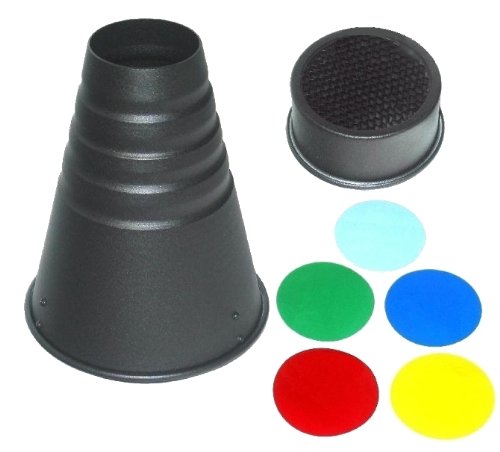 - Includes 6mm (40°) honeycomb grid and a 5 color gel filter set.