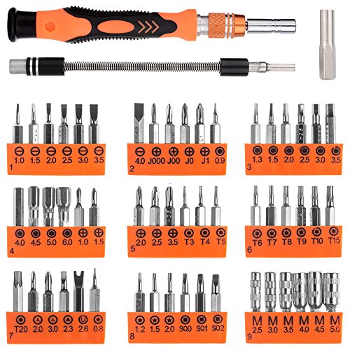 -. Feature : 54 bits well selected by vaster to serve modern electronics that serves all popular laptops, phones, game consoles and other electronics / Professional portable hardware tools with perfect weight & compact design for easy portability / The unique non slip driver in the market is machined from a single piece of aluminum and cover with the silica gel / The flexible shaft is great for stereo work or other large electronics where all the screws are not on the surface
