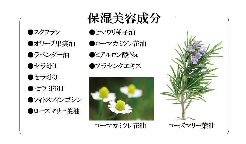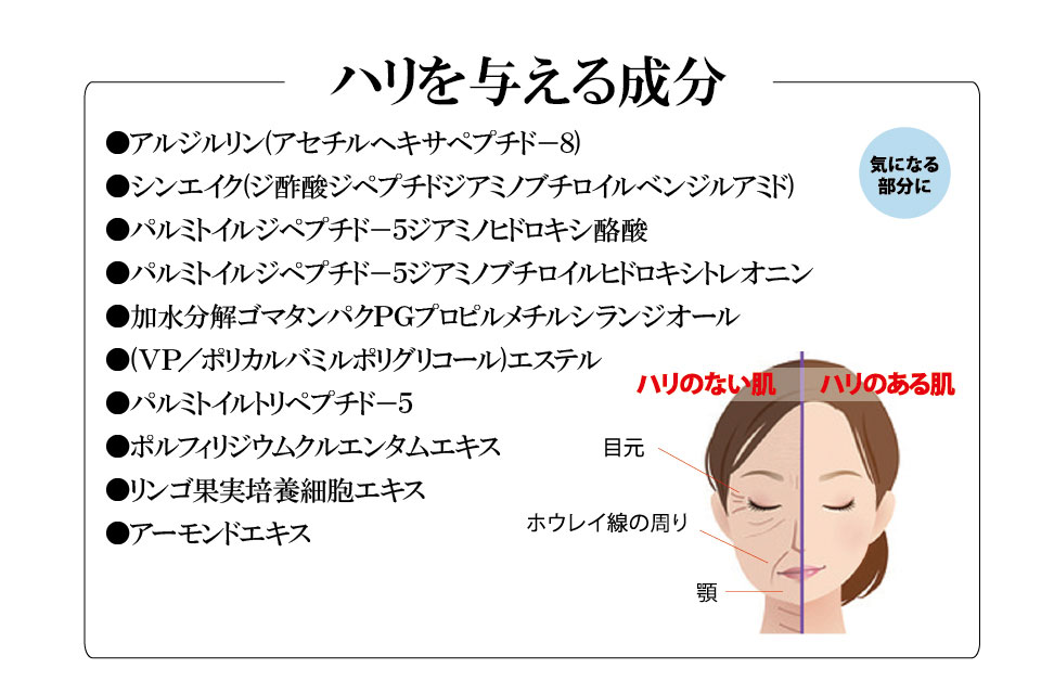 | 成分 | 水、グリセリン、BG、セテアリルアルコール、エチルヘキサン酸セチル、コメヌカ油、スクワラン、オリーブ果実油、ヒマワリ種子油、ステアリン酸グリセリル、パルミチン酸セチル、ジメチコン、シクロペンタシロキサン、プラセンタエキス、ヒアルロン酸Na、グリチルリチン酸2K、アセチルヘキサペプチド-8、パルミトイルトリペプチド-5、ジ酢酸ジペプチドジアミノブチロイルベンジルアミド、パルミトイルジペプチド-5ジアミノヒドロキシ酪酸、パルミトイルジペプチド-5ジアミノブチロイルヒドロキシトレオニン、加水分解ゴマタンパクPGプロピルメチルシランジオール、ポルフィリジウムクルエンタムエキス、リンゴ果実培養細胞エキス、アーモンドエキス、(VP/ポリカルバミルポリグリコール)エステル、ローズマリー葉油、ローマカミツレ花油、ラベンダー油、セラミド3、セラミド6II、セラミド1、フィトスフィンゴシン、アラントイン、クレアチン、シトルリン、プルラン、ラウロイル乳酸Na、ステアリン酸PEG-40、ステアリン酸PEG-10、ステアリン酸ソルビタン、コレステロール、レシチン、ヒドロキシプロピルメチルセルロース、キサンタンガム、カルボマー、アクリレーツコポリマー、クエン酸Na、クエン酸、カプリリルグリコール、フェノキシエタノール、香料 |