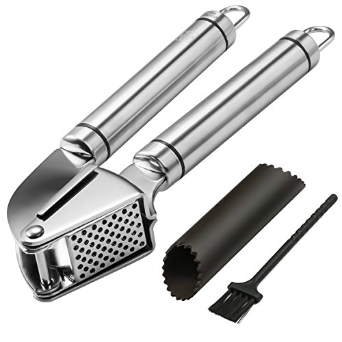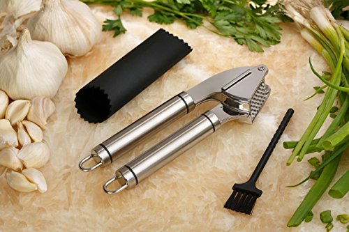 A-FUN Stainless Steel Garlic Press and Peeler Tube Set, Garlic Mincer, Crusher, Masher with Silicone Garlic Tube Roller Peeler and Easy Clean Brush