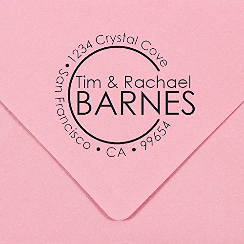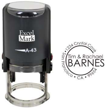 -. Feature : A custom self inking address stamp personalized with your name(s) and address in the font and circular style shown / Self-inking design allows for rapid, repetitive stamping / Sturdy stamp mount features an open base to easily align impressions / Round impression area: 1-5/8" diameter / Available in your choice of the following ink colors: black, red, blue, green, purple or brown