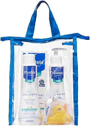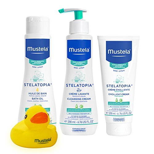Cleanse, soothe, and replenish your baby or child’s eczema-prone skin with Mustela’s Eczema-Prone Skin Bath time Set. This set includes three fragrance-free, natural skincare products specifically designed for babies and children with eczema. Follow Mustela’s three-step clinically proven eczema care routine: first add one or two capfuls of Stelatopia Bath Oil to your baby’s bath water to instantly replenish and soothe the skin, then wash face and body with Stelatopia Cleansing Cream, follow with Stelatopia Emollient Cream to moisturize and maintain a healthy skin barrier. Each Stelatopia product is formulated with Avocado Perseose, a patented natural ingredient to help protect and hydrate a baby's delicate skin, and sunflower oil distillate to soothe and replenish the skin with lipids. The Eczema-Prone Skin Bath time Set also includes a yellow rubber duck for bath time fun! Protect and care for your baby or child’s eczema-prone skin with proven, safe, and effective Mustela Stelatopia products. Fragrance-free. Paraben, Phthalate, and Phenoxyethanol free. Hypoallergenic and specially formulated to minimize the risk of allergic reactions. Tested under dermatological and pediatric control.