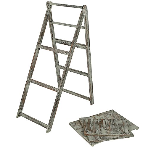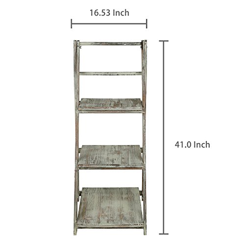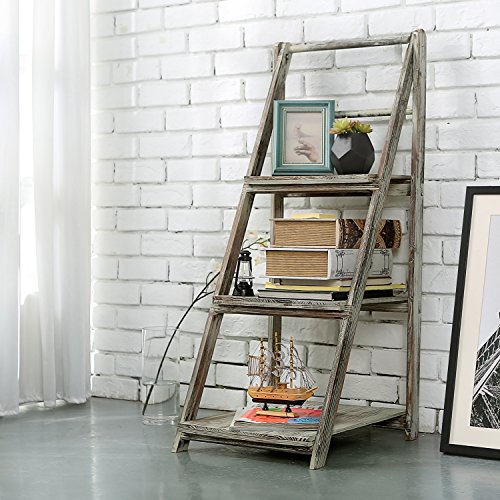 Wooden A-frame style ladder bookshelf with rustic torched finish.