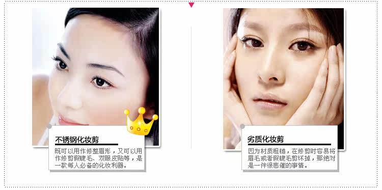 | 剪刀使初学化妆者也能轻松掌握! [店主提示:如使用起来偏紧,请把中心一字螺丝调松就可以了!] 剪美目贴: 非常好用,一刀下去就成形,弧度更自然,推荐各位必备一把。 剪多余眉毛: 剪刀剪头自然弯曲,易于肌肤贴合,符合眉毛的弯曲的形状很容易就把眉毛修剪成自然的形状哦,使用方便。 |