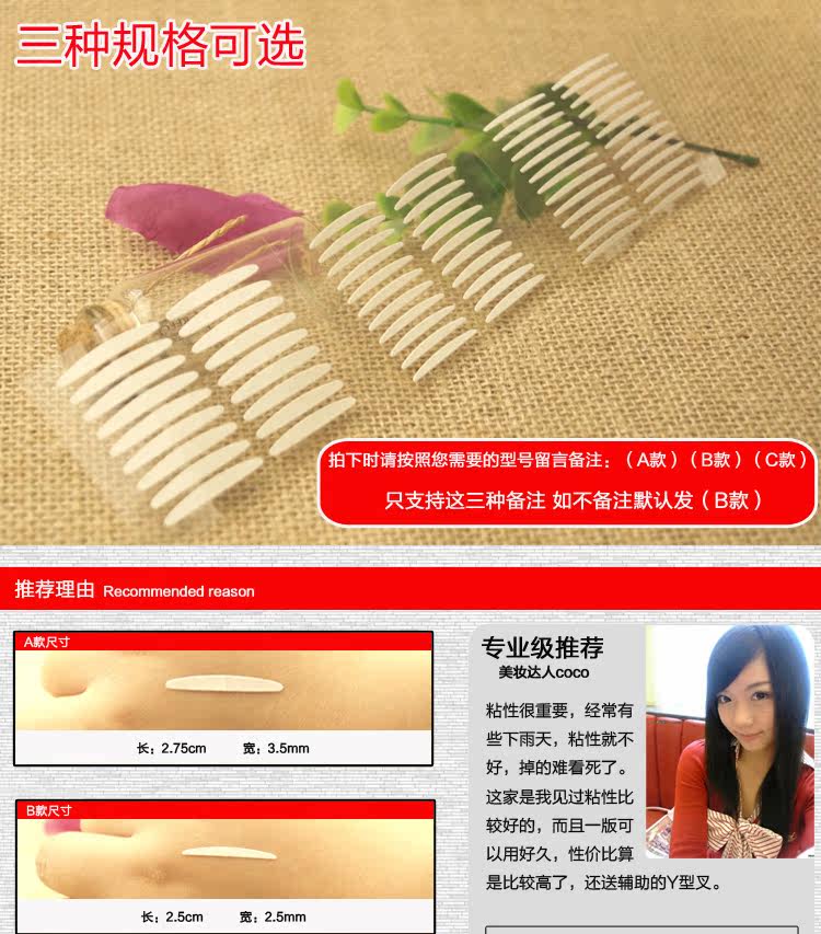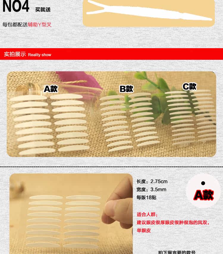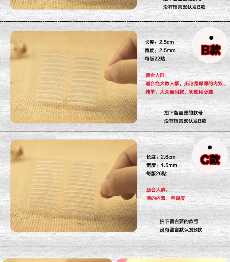此款眼皮贴有A款 B款 C款 亲们需要哪款备注留言哪款的哦 三个款式 每款是20张 因每张型号的宽度不同 总帖数也不同 A款每张18贴 一份是360贴 B款每张是22贴 一份是440贴 C款每张是26贴一份是520贴