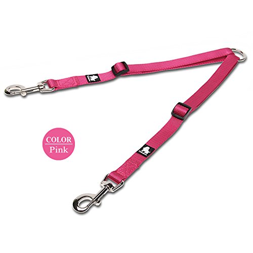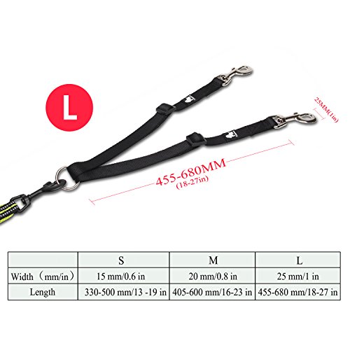 Products Features 1.??Walk to two dogs with one double dog leash. Double dog leash for big dogs and small dogs, or both! No point in buying a dog retractable leash if you have two dogs, just buy one double dog leash. 2.??Stainless steel O-ring Tangle resistant design with a strong Stainless steel O-ring and Zinc-alloy hooks makes it easy to keep dogs on leash.The tensile strength of stainless steel O-ring is up to 8000 N. SIZE INFORMATION