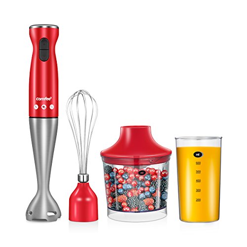The Comfee 3-In-1 Hand Blender comes with 1 Blending Stick, 1* 0.5L BPA-Free Chopper bowl, 1 *600ml BPA-Free whisk, 1*600ml BPA-Free Beaker. Perfect for mixing up fruits and vegetables for smoothies, or beating eggs and flour for a cake
