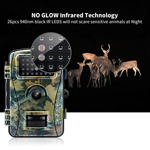 - NO GLOW FLASH: Equipped with 26pcs 940nm black IR LED which have 30% reduced flash range and undetectable by the human and animal eye,if you want to keep your camera safe at night and don't been stolen, or if u are trying to get image of a particularly sensitive animals like deer,this no-glow trial cam will be more appropriate.