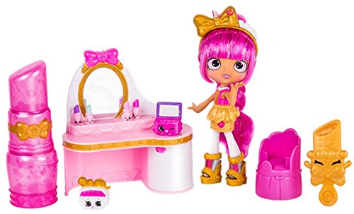 -. Feature : Includes 2 excluisve Shopkins, Iris Eye Shadow and Marcee Makeup Bag / Display and store your Shopkins on the lipstick cabinet / Set up your Mini Lipstick Shopkins on the beauty vanity (there's a place for the brush, too!) / Vanity chair seats both Shopkins and Shoppies / Lippy Lulu comes with doll stand, hair bursh, and a VIP Card that unlocks bonus content in the Welcome to Shopville App
