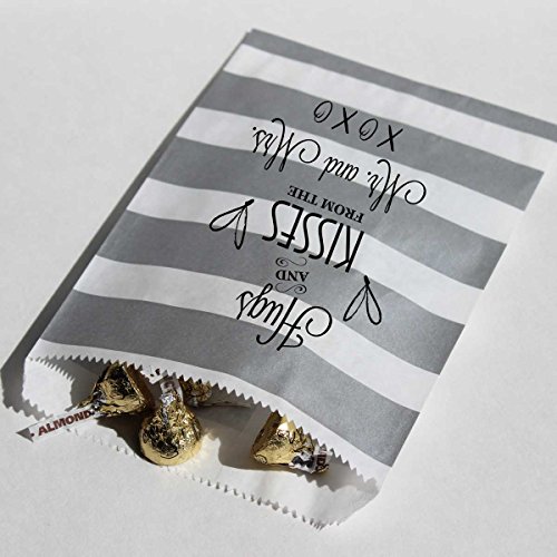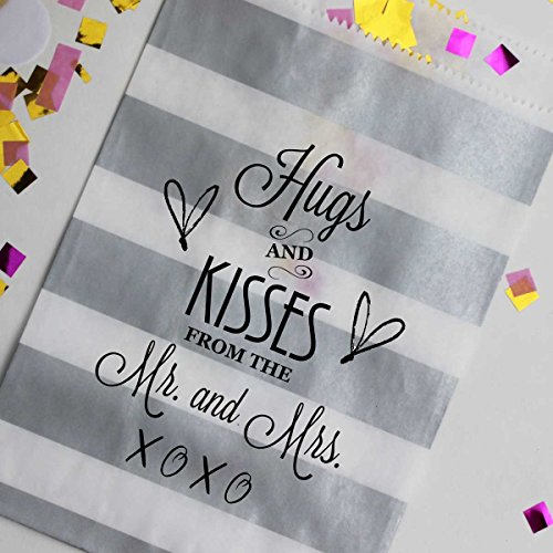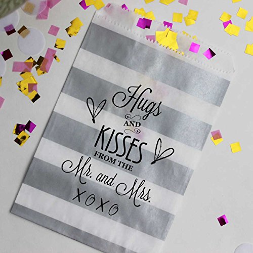 Hugs and Kisses from the Mr and Mrs Favor Bags, White and Silver Stripe Candy Bags, 5.5 x 7.5, Set of 48 Bags and 48 Stickers