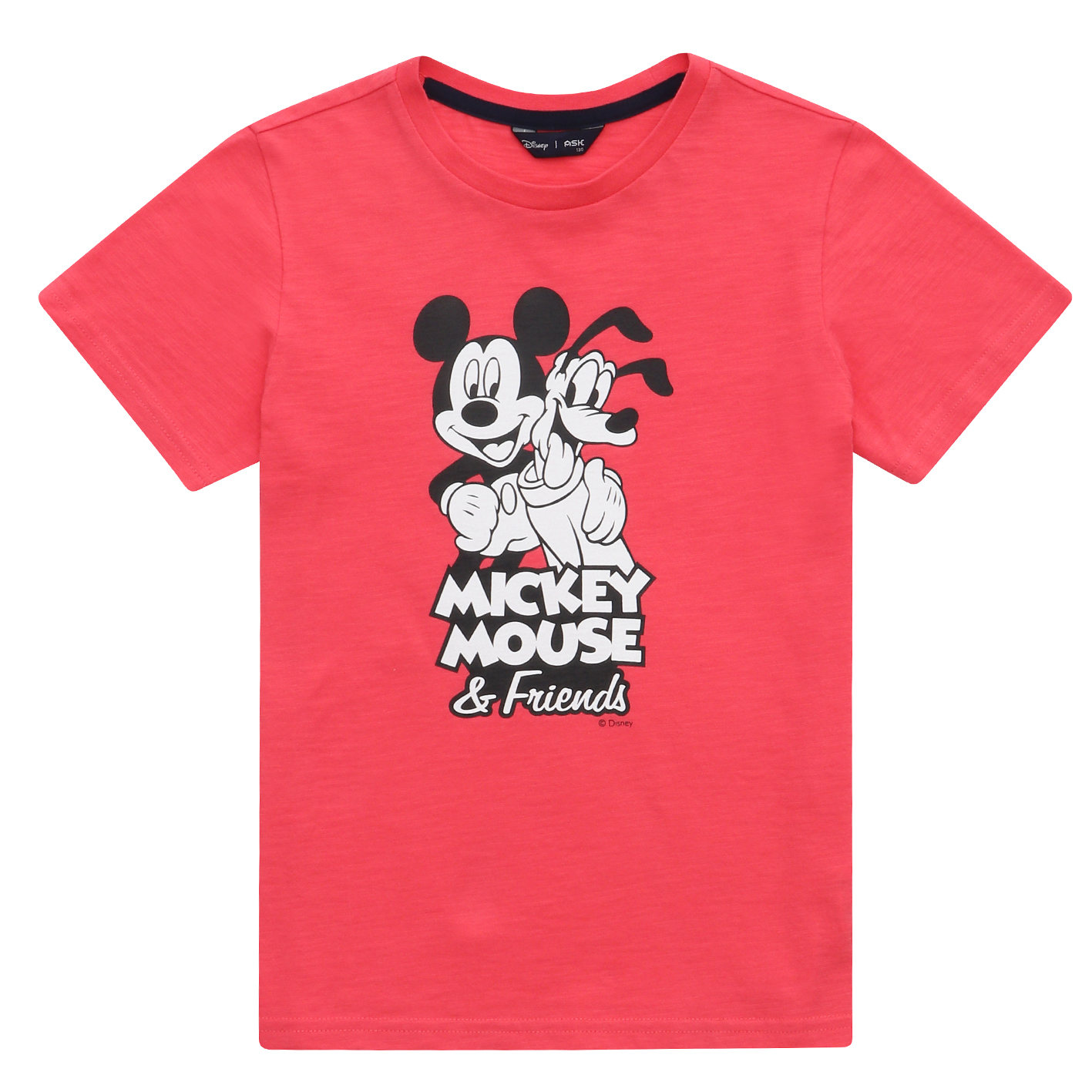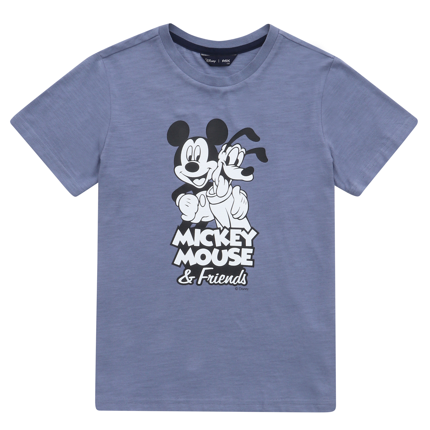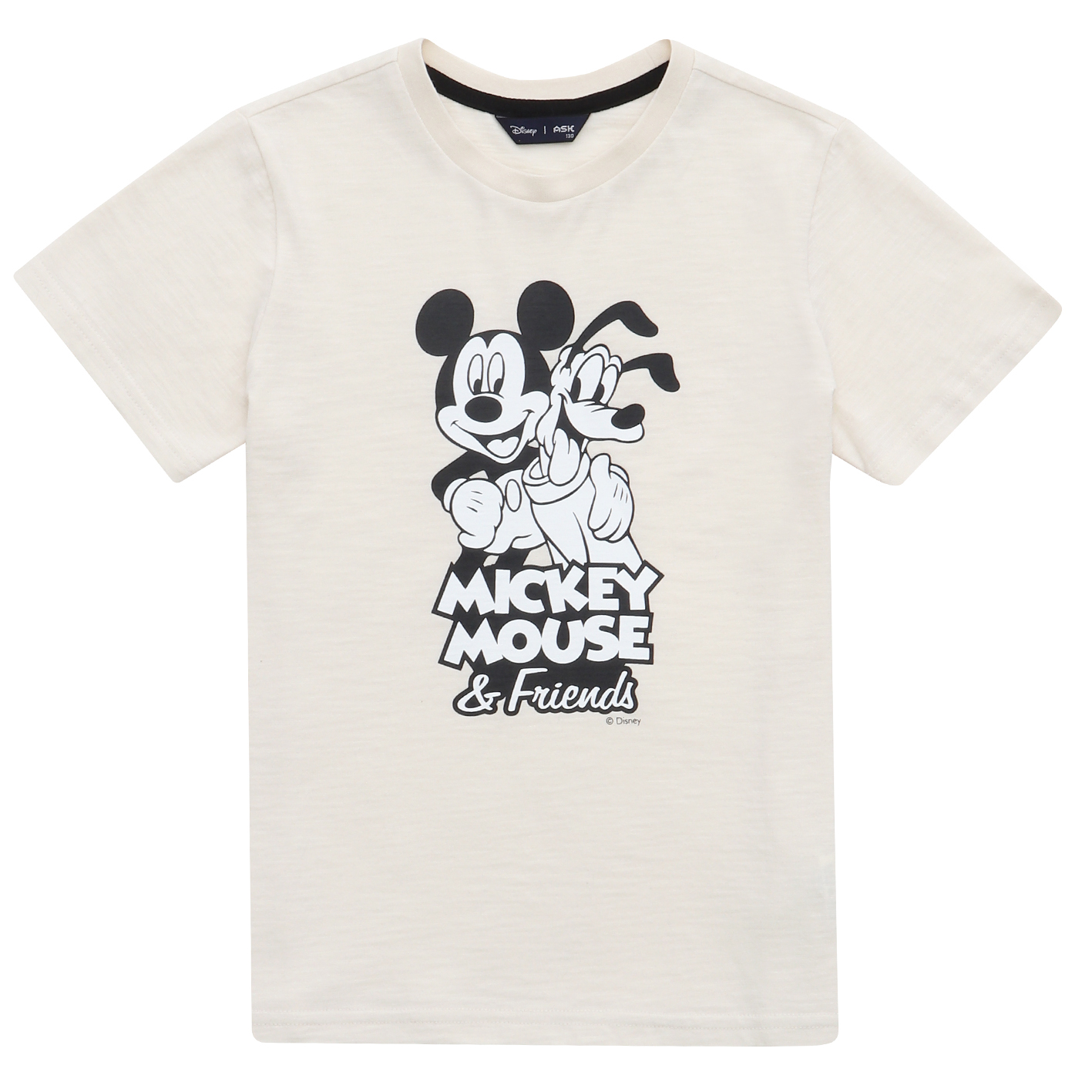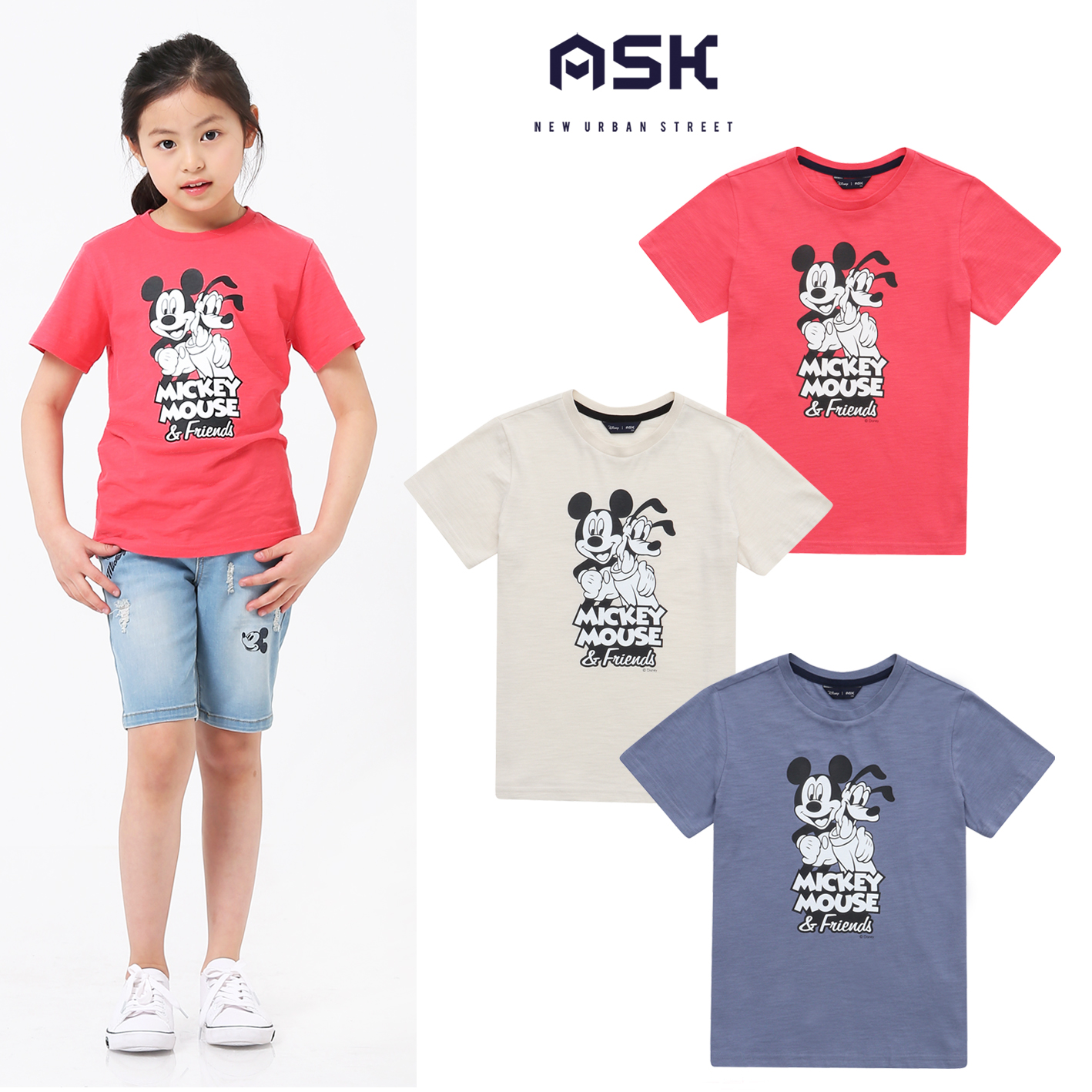 30수 싱글 슬럽 소재의 기본 티셔츠. 미키와 플루토 아트웍으로 포인트를 주어 유니 전략으로 판매하기 좋은 아이템.