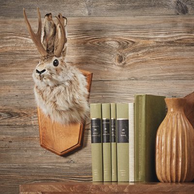 Studio : Kotulas Publisher : Kotulas Binding : Kitchen Product Description Fearsome creature, freak of nature or just a pile of malarkey? The horned hare has sparked this great debate for decades. And now you can bring the battle of folklore right into your own living room with this realistic taxidermy specimen. The furry, shoulder-mount jackrabbit sports a real rack of antlers and is mounted on a classic wooden plaque that will do any fireplace proud. To add to the mystique, no two Jackalope mounts are alike. From tales of the chase to the evidence of the accompanying Jackalope hunting permit, you're sure to have guests hopping on the believer bandwagon and hanging on your every word. Approx. 8"L x 8"W x 18"H. 0
