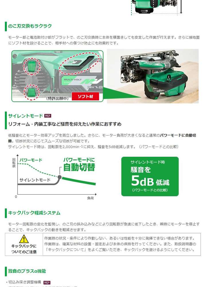 ●キックバック軽減システム搭載。モーター回転数の変化を監視し、のこ刃の挟み込みなどにより回転数が急速に低下したとき、瞬時にモーターを停止することで、キックバックの動きを軽減させます。