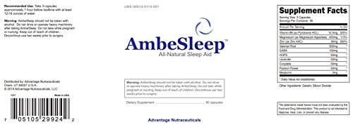 -. Binding : Health and Beauty -. Brand : Advantage Nutraceuticals -. EAN : 0705105299242 -. Feature : Fast acting formula to help you get to sleep faster and easier without the frustration / Get deeper, more restful sleep with more time spent in REM so you get the most out of each night / Feel awake, rejuvinated & ready for your day after a good night's rest with Ambesleep / Safe and effective alternative to prescription sleep-aids without harmful chemicals and narcotics / All natural ingredients so you don't have to deal with negative side effects or dependency -. Label : Advantage Nutraceuticals -. LegalDisclaimer : All material and information provided on this Site was created and intended as general information and should NEVER be considered medical advice, healthcare advice, legal advice, and is not to be used to diagnose, treat or address any medical or health issue. The information and material on this Site should never replace the advice of a qualified health professional or physician. Any visitor deciding to use any product or service provided on this site should always consult your physician. -. Manufacturer : Advantage Nutraceuticals -. MPN : AM -. NumberOfItems : 1 -. PartNumber : AM -. ProductGroup : Health and Beauty -. ProductTypeName : HEALTH_PERSONAL_CARE -. Publisher : Advantage Nutraceuticals -. Size : 1 Pack -. Studio : Advantage Nutraceuticals -. Title : Ambesleep - Sleep Aid - Over the Counter Sleep Aid - Best Sleeping Pills - Get a Healthy Nights Rest -. UPC : 705105299242