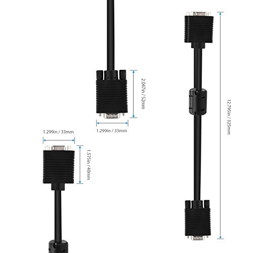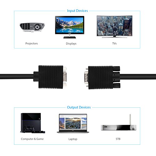 High performance VGA cable connects a VGA (Video Graphic Array) equipped computer to a monitor or projector with 15-pin VGA port (also known as RGB, DB-15, DE-15, HD-15, HDB-15 or D-sub 15) for video editing, gaming, or video projection.