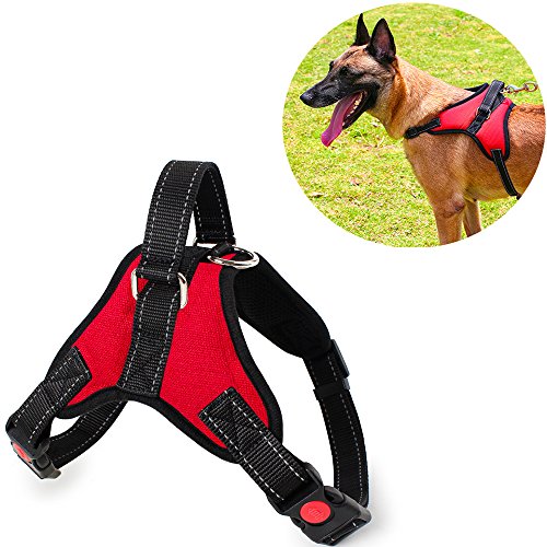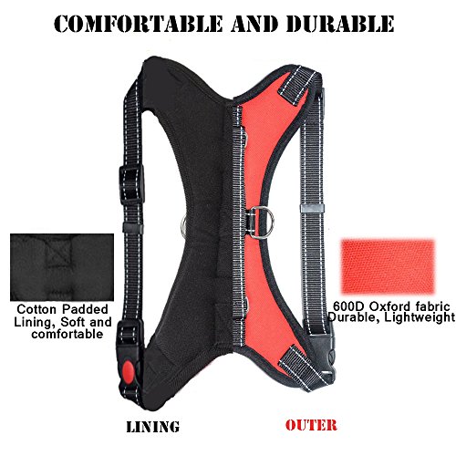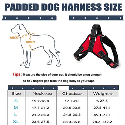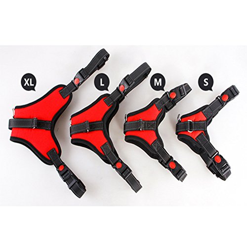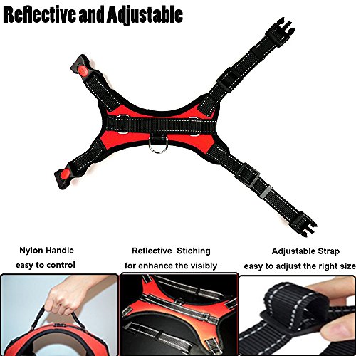 Features: ? With our no pull no-choke dog harness, you can keep your beloved dog safe and comfortable ? The Saddle type design with the adjustable clip on neck and chest, and the padded lining, eliminate pressure and effectively prevent potential neck injuries ?Easy to use even for car rides by slipping the seat belt through the handle. ?Padded sponge dog vest filling makes your dog perfectly comfy ?Reflective safety design keeping your best friend safe during the dark or early morning. ?The Heavy duty harness with nylon handle let you easy to control your pulled dog or lift they up over the obstacle. ?Metal D-Ring guide you attach a leash to walking your dog, also a great training, travel harness.What's more, It effect avoid using dog collar to cause respiratory problems or even lead to more serious injuries like a collapsed trachea.