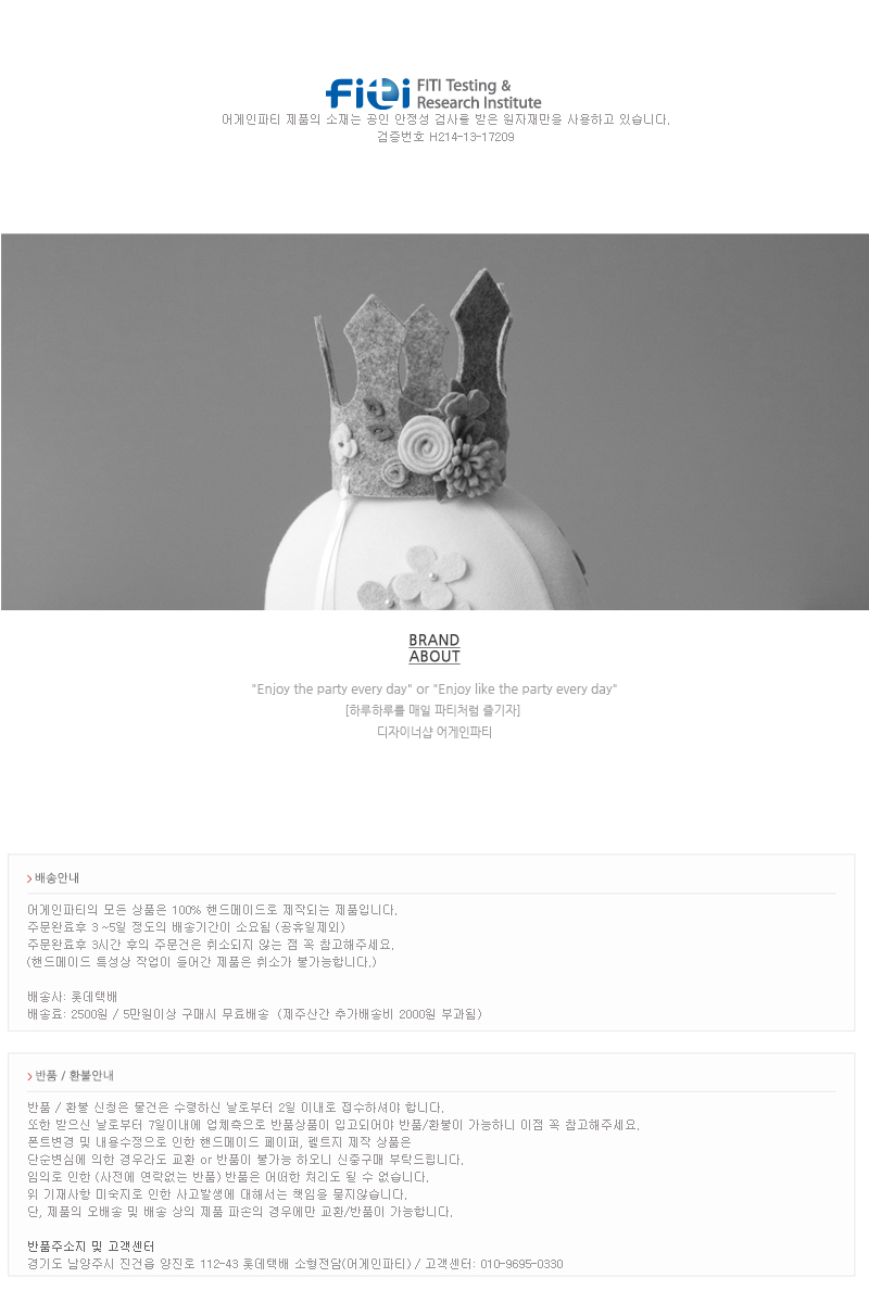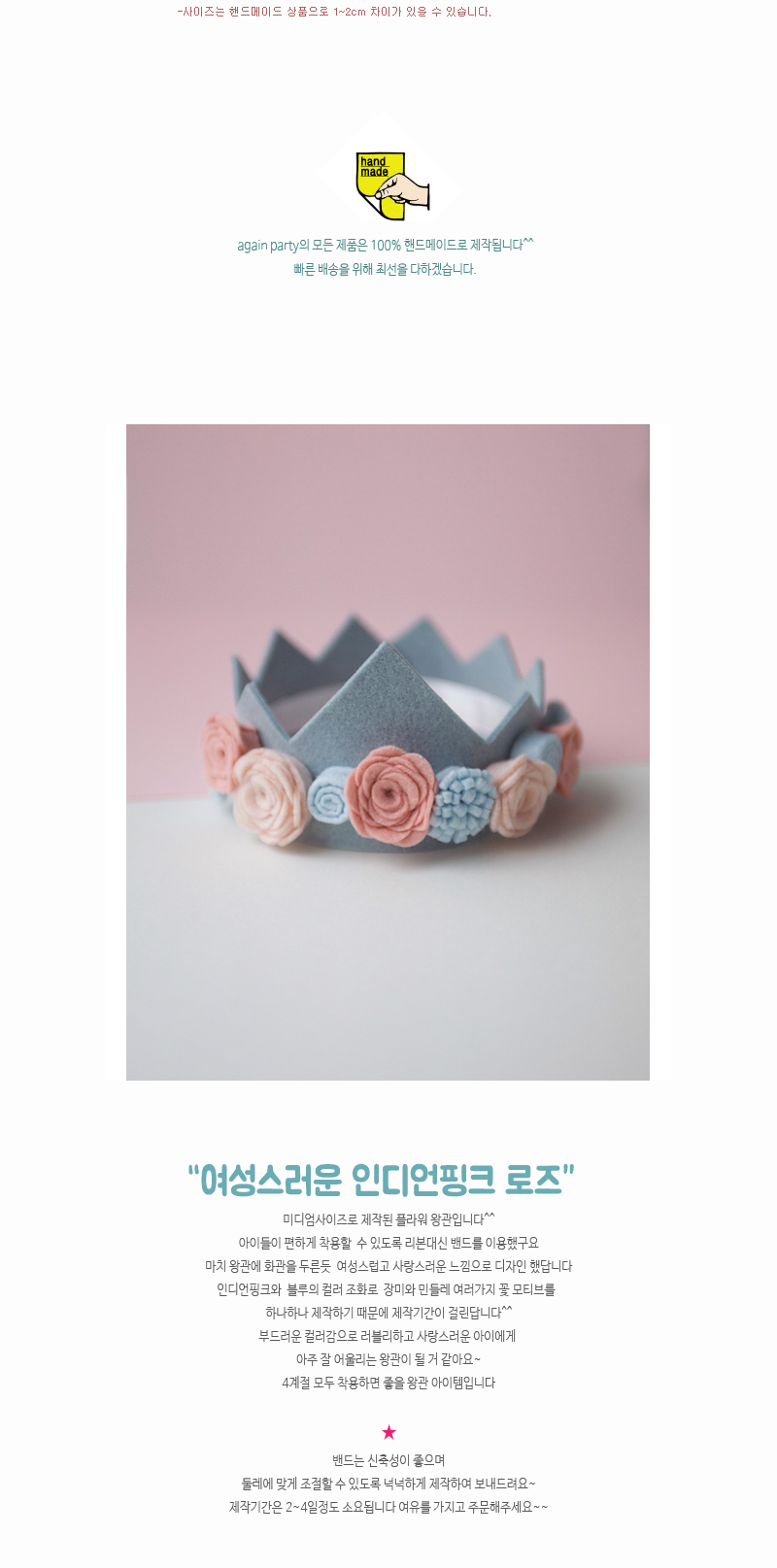 "어게인파티 제품의 모든 상품은 100% 핸드메이드로 제작되는 제품입니다. 주문완료후 3~5일 정도의 배송기간이 소요됩니다.(공휴일 제외) 주문완료후 3시간 후의 주문건은 취소되지 않는 점 꼭 참고해주세요 (핸드메이드 특성상 작업이 들어간 제품은 취소가 불가능합니다.)"
