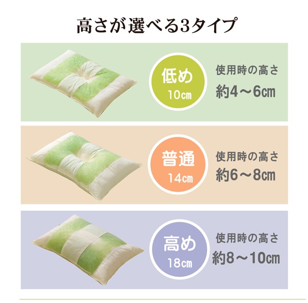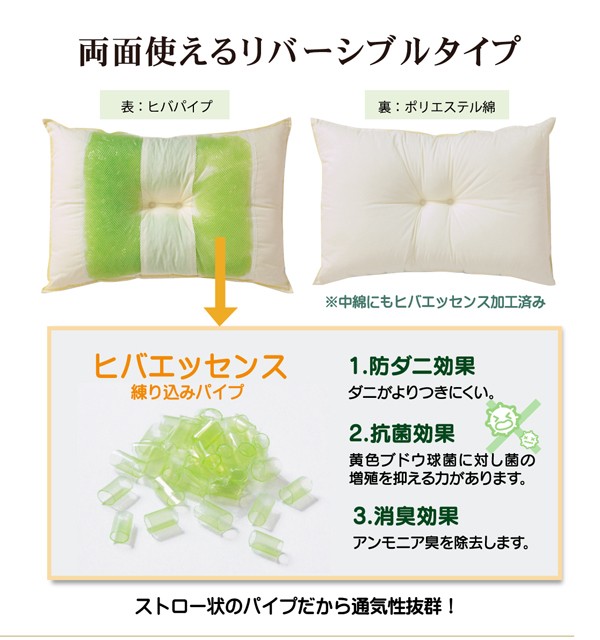 選べる高さが3種類。ご希望のサイズを選んで下さい。ヒバエッセンス練り込みパイプを使用しています。青森県のヒバの木から抽出した「ヒバエッセンス」をメーカー独自の技術でパイプに加工しました。ヒバエッセンスにはヒノキチオールという、天然物質としては極めて抗菌性の高い成分が含まれています。(無加工品に比べ抗菌・防臭効果があります。)ヒバエッセンスで安らかな森の眠りをご提案します。パイプ使用のため、通気性がよく、熱がこもらず心地よくご使用できます。リバーシブルタイプでひばパイプ側、ポリエステルわた側の2種類の触感を楽しめます。※中材の出し入れはできません。