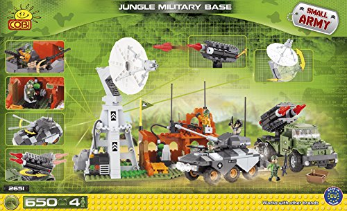 -. Feature : Build a new adventure with COBI construction sets (each sold separately) / Build the Jungle Military Base / This Small Army set includes 650 pieces, 4 figures and a ton of accessories / The Military Base is set in the ruins of a building (still well-armed and ready for defense) / This item is a great addition to the extended Small Army collection