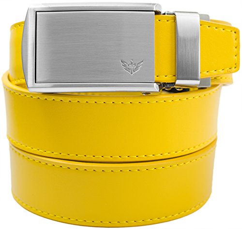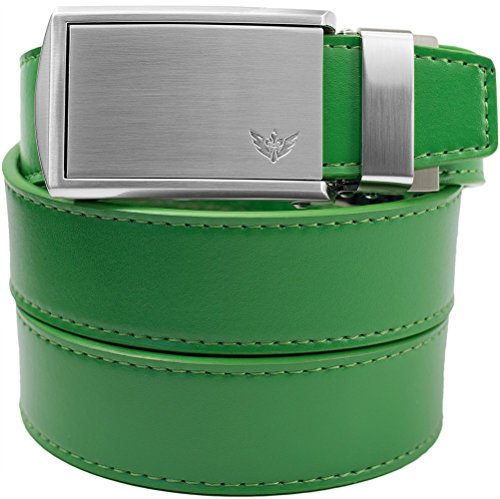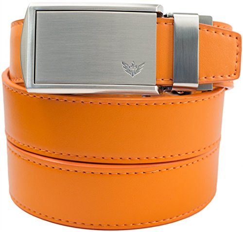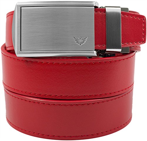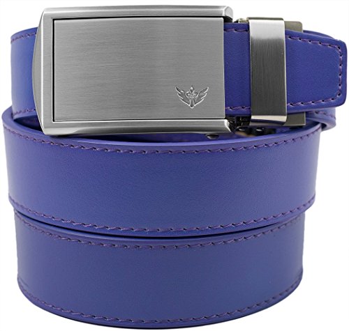 - Feature : Leather ratchet belts without holes provide over 30 unique adjustments for a perfect fit. / Trim-to-fit. Fits up to a 48" waist size. Easy to customize to your size and super-comfortable to wear. / Smooth dual-lever release system is simple to use and makes adjusting your belt effortless. / Straps are 1-1/4" (3.2 cm) wide. / Buckles are 1-5/8" (4 cm) wide x 3-1/2" (9 cm) long.