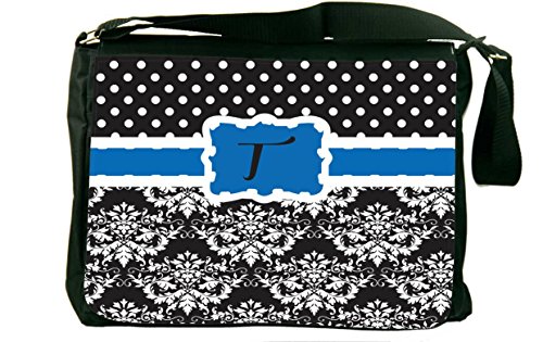 Studio : Rikki Knight LLC Publisher : Rikki Knight LLC Binding : Office Product Product Description Whether from home to the office, on a business trip or to school, the Initial "t" Blue black Damask Dots laptop bag notebook bag messenger bag school bag keeps you comfortable and your cargo safe and sound - this bag features pockets on the outside below the flap for your cellphone, pens, iPod, notebook etc. And also a zippered compartment on the inside, with plenty of space to store your textbooks, folders, files, etc. And up to a 14 inch laptop (laptop sleeve sold separately) - the vibrant image on the front is professionally printed and will not fade or peel with time and this bag will surely be an eye catcher wherever you go with it. Disclaimer: all images are printed directly into the material - the Texture of the image will always be a flat surface. Any images that appears to be 3D, textured, or glittery are flat printed images. 0