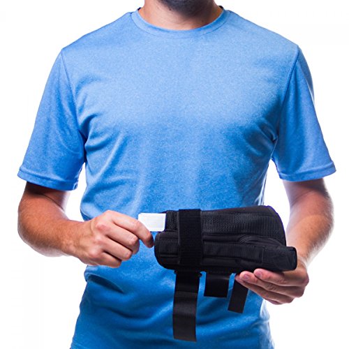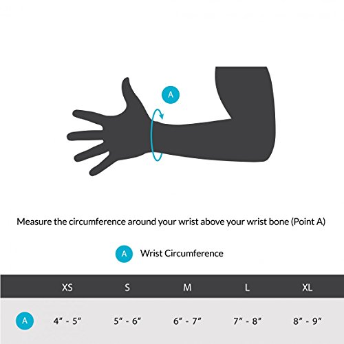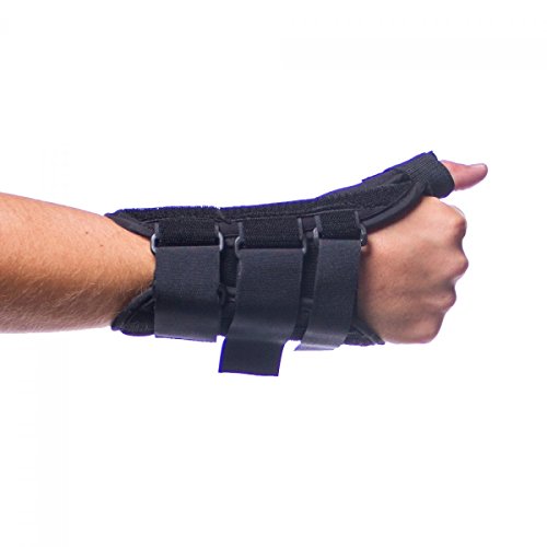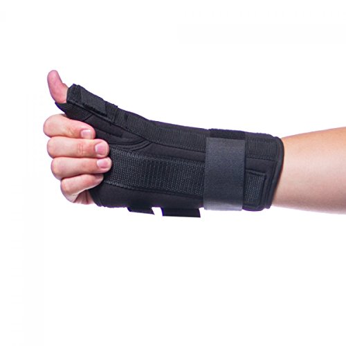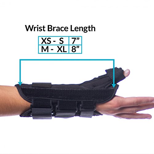 -. Feature : Supports and immobilizes the thumb and wrist, leaving the fingers free / Made of a durable material that is breathable and padded for maximum comfort / Contouring design allows for the fingers to move and spread out / Used to treat wrist or thumb tendonitis, De Quervain's disease, arthritis, thumb or wrist sprains or strains, and rhizarthrosis. / Sizes XS-XL available, measure the circumference around your wrist, above your wrist bone