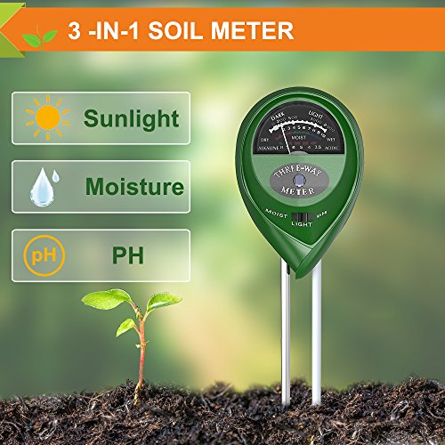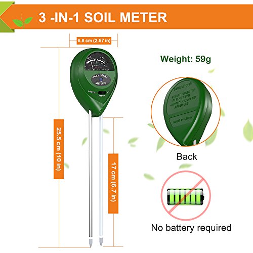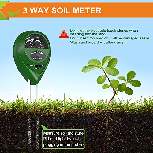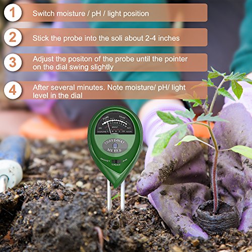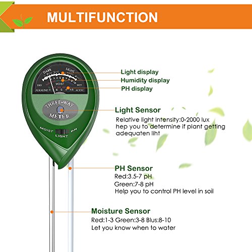 -. Feature : 🍅🍅3-in-1: Tests moisture,let you know when to water. You will never over/under water your plants again with this tester.Meters PH value,to control Ph level that acidic or alkaline for your plants.Detects light, to determine if plant getting adequate light. / 🍓🍓Easy to Use: The 3-in-1 moisture meter with light & ph humidity test function don't need batteries, and you can use it indoor or outdoor. Insert probe into soil around 2-4 inches, then toggle switch to tester what you want to measure. / 🌼🌼Accurate Reading: PH Range: 3.5-8pH (3.5-6.5 Acid, 7-8 Alkaline), Moisture Range: 1-10 (1-3 Dry, 4-7 Nor, 8-10 Wet), Relative Light: 0-2000lux (0-200 Low, 200-500 Low+, 500-1000 Nor, 1000-2000 High). / 🍀🍀Wide Uses: The moisture meter is a ideal tool to test soil conditions ( pH/Moisture/sunlight intensity) of fruits, flowers, vegetables, shrubs, etc. be kept in the soil for 10 minutes or more. You can test for more times and get the average value for more accurate date. / 🎄🎄Warm Tips:1, Do not touch the stone or hard rock soil, if the soil is too hard and dry, easy to damage the probes. 2. Design for testing soil ONLY. 3. After using, need to clean and wipe the probes.4.measurement of moisture and pH must be viewed while the unit is in the soil,And, the tester must