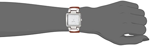 Accent your work wear with the refined style of the Polished Silvertone Strap Watch by Nine West. A polished silvertone square case with sleek curves and swing lugs sits beautifully on a honey-colored luggage strap for a simple, elegant look. With a unique dial and silvertone markers, this modish watch is the perfect style accessory.Feature