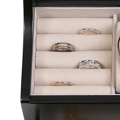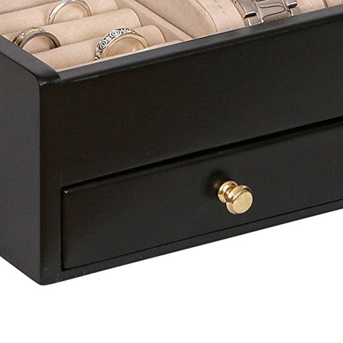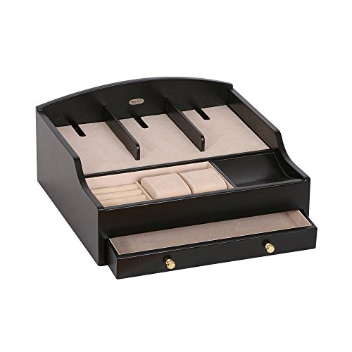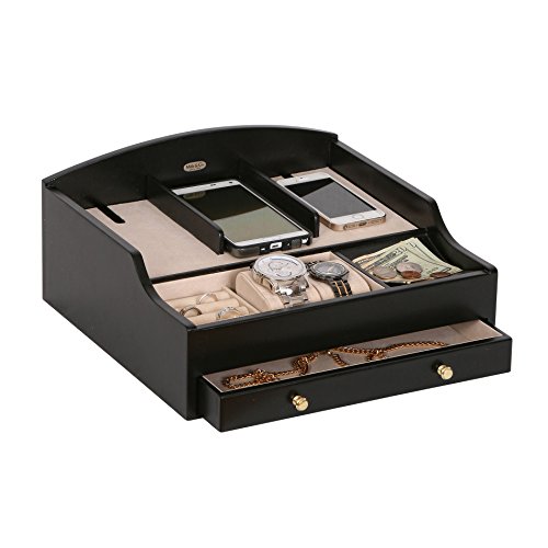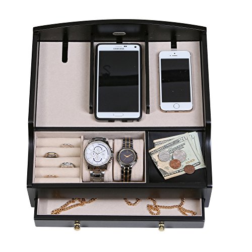 The Mele & Co. Ricardo charging valet is a dresser top jewelry box and catch-all perfect for both him and her. Three compartments offer custom storage for your mobile devices and includes hidden storage underneath to help corral power cords (power cords not included). Two sections feature removable watch cushions where you can store your finer watches or other accessories. The coin slide neatly corrals your loose change, flash drives and key fobs, while the ring roll section provides safe harbor for your rings. The full width drawer offers extra storage and an out-of-sight place to tuck away credit cards and a second watch. The hand lined ivory sueded interior protects accessories and keeps items in place. Sturdy silver tone drawer pulls and hardware offer smooth access and closure. Highlighting the company's brand legacy, each valet box features the Mele & Co. logo plate. Offering convenience and thoughtful amenities, this sleek and simply styled valet is the perfect staging area for the modern mobile maven and makes a great couples gift. Dimensions: 12 1/2" W x 12" D x 5 3/4" H.Feature