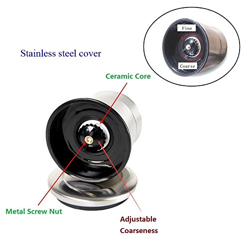 - COARSENESS ADJUSTMENTS - The grinding mechanism of these salt&pepper shakers can be adjusted, twist the knob on the top to adjust spice grind fineness, suitable for milling all sorts of difference spices