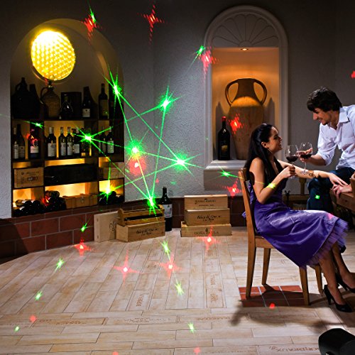 - EASY OPERATION: No remote, built in daily 6-hour on, 18-hour off cycle automatically. Control the Projector light via 2 button on the back: left power button on the back to control color( Red/ Green/ Red & Green) and the right push button to choose dynamic or static modes. ( Best for your home lighting at night, lighting-off at daytime)