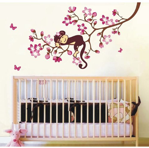 -. Binding : Baby Product -. Color : Pink -. Feature : whole visual size on the wall will be 48" width by 24" height as the picture show / Sheet size: 27"x 20" and made from Eco-friendly PVC film / Removable and repositionable / will never remain any residue on the wall / Easy to use just Peel & stick -. IsAdultProduct : 0 -. Label : walldecorer -. Manufacturer : walldecorer -. PackageQuantity : 1 -. ProductGroup : Baby Product -. ProductTypeName : BABY_PRODUCT -. Publisher : walldecorer -. Studio : walldecorer -. Title : A Sleeping Baby Monkey on Cherry Blossom Tree Branch Nursery Wall Decor Baby Girl's Bedroom Wall Decal Kid's Room Sticker Removable Pink Baby Monkey Decal