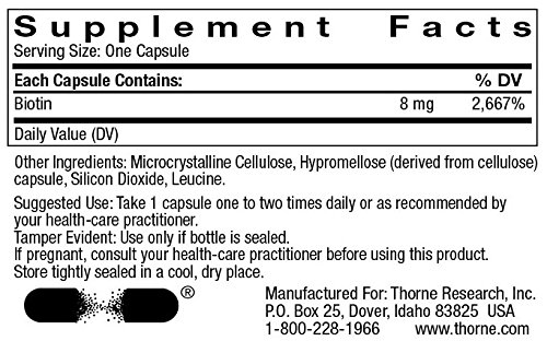 -. Binding : Health and Beauty -. Brand : Thorne Research -. Label : Thorne Research -. Manufacturer : Thorne Research -. ProductGroup : Health and Beauty -. ProductTypeName : HEALTH_PERSONAL_CARE -. Publisher : Thorne Research -. Studio : Thorne Research -. Title : Thorne Research Biotin-8, 60 Vegatarian Capsules