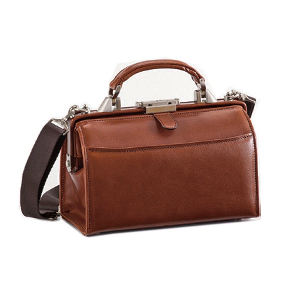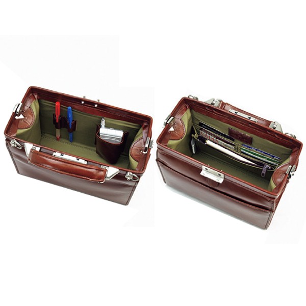 正面:アテポケット、本体内部:ファスナーポケット付ササマチポケット、携帯ポケット、ペン差し、6段式カード入れ、ショルダーベルト、ワンタッチ錠前、底鋲付、A5サイズが収納可能(21.0×14.8)、携帯電話収納ポケット付、カラー:チョコ