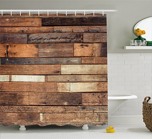 Wooden Shower Curtain Set by Ambesonne, Rustic Floor Planks Print Grungy Look Farm House Country Style Walnut Oak Grain Image, Fabric Bathroom Decor with Hooks, 70 Inches, Brown