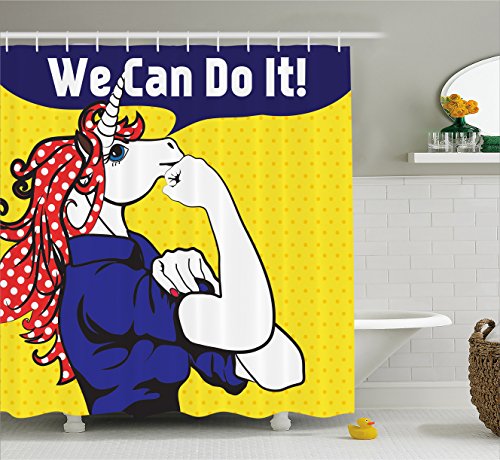 Unicorn Shower Curtain Set by Ambesonne, Feminist Unicorn with Famous Gesture on Polka Dots Setting Strength Humor Image, Fabric Bathroom Decor with Hooks, 70 Inches, Multi