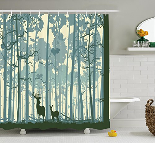 Deer Shower Curtain Set by Ambesonne, Silhouette of Animal in Foggy Forest Animals in Nature Themed Cartoon Dusk, Fabric Bathroom Decor with Hooks, 75 Inches Long, Forest Green and Cream