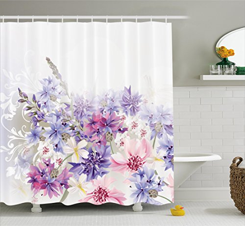 Lavender Shower Curtain Set by Ambesonne, Pink Purple Cornflowers Bridal Classic Design Gentle Floral Art Wedding Decorations Print, Fabric Bathroom Decor with Hooks, 70 Inches, Violet Pink White