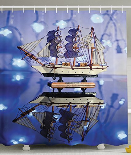 Ocean Decor Shower Curtain by Ambesonne, Sail Boat on Blue Magic Neon Flashlights Mirror Reflection Alluring Yacht, Polyester Fabric Bathroom Decor Set with Hooks, Blue Beige Khaki and Navy