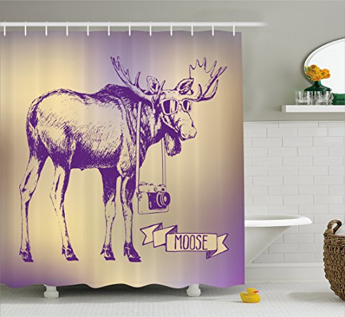 Moose Shower Curtain Set by Ambesonne, Hipster Deer with Shades Sunglasses and Camera Vintage Ombre Design Funny Animal Art, Fabric Bathroom Decor with Hooks, 70 Inches, Purple Beige
