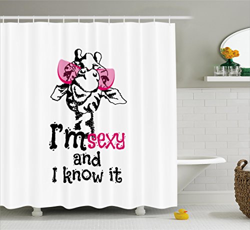 Giraffe Shower Curtain Set by Ambesonne, Funny Animal in Pink Glasses with Quote '' I am sexy and I know it'' Fashion, Fabric Bathroom Decor with Hooks, 70 Inches, Pink Black White
