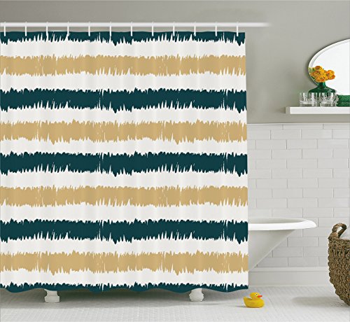 Striped Shower Curtain Set by Ambesonne, Navy Blue and Beige Paintbrush Strokes Design Lines Hand Drawn Style Artsy, Fabric Bathroom Decor with Hooks, 70 Inches, Dark Blue White Beige