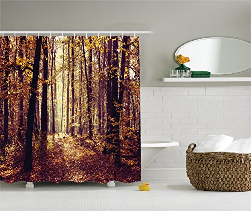 Nature Landscapes Shower Curtain Set By Ambesonne, Misty Weather Mysterious Forest Picture Print, Bathroom Accessories, 69W X 70L Inches