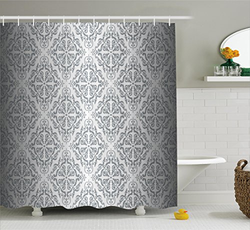 Silver Shower Curtain Set by Ambesonne, Vintage Mandala Baroque Patterns Monochrome Victorian Antique Ornaments Retro Damask, Fabric Bathroom Decor with Hooks, 70 Inches, Grey